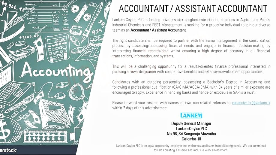 Lankem Ceylon PLC, a leading private sector conglomerate offering solutions in Agriculture, Paints, 30. Industrial Chemicals and PEST Management is seeking for a proactive individual to join our diverse team as an Accountant/Assistant Accountant