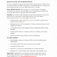 Apply Now! If organization is your skill and you want a career that combines administrative skill with a love for hospitality, we’d be thrilled to hear from you. Please forward your CV to ravinanayakkara@outlook.com