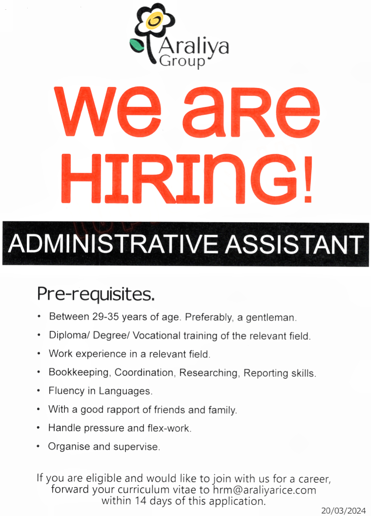 If you are eligible and would like to join with us for a career, forward your curriculum vitae to hrm@araliyarice.com within 14 days of this application.