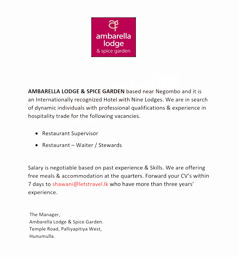 Salary is negotiable based on past experience & Skills. We are offering free meals & accommodation at the quarters. Forward your CV’s within 7 days to shawani@letstravel.lk who have more than three years’ experience.