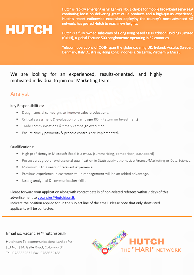 Email us: vacancies@hutchison.lk