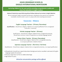 Qualifications – Should have a degree / diploma from a recognized university, Should have minimum 2 years of experience as a Sinhala language teacher.