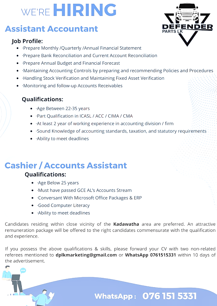 Job Profile:·• Prepare Bank Reconciliation and Current Account Reconciliation•Prepare Monthly /Quarterly /Annual Financial Statement••Prepare Annual Budget and Financial Forecast·•187DEFENDERPARTS LK•Maintaining Accounting Controls by preparing and recommending Policies and Procedures.•Handling Stock Verification and Maintaining Fixed Asset Verification• Monitoring and follow-up Accounts ReceivablesQualifications:• Age Between 22-35 years• •Part Qualification in ICASL/ACC/CIMA / CMA•At least 2 year of working experience in accounting division / firm• Sound Knowledge of accounting standards, taxation, and statutory requirements• Ability to meet deadlines