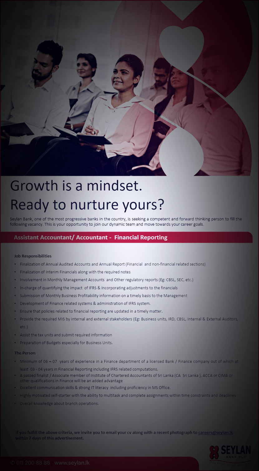 If you fulfill the above criteria, we invite you to email your cv along with a recent photograph to careers@seylan.lk within 7 days of this advertisement.