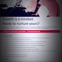 Minimum of 06-07 years of experience in a Finance department of a licensed Bank / Finance company out of which at least 03 – 04 years in Financial Reporting including IFRS related computations.