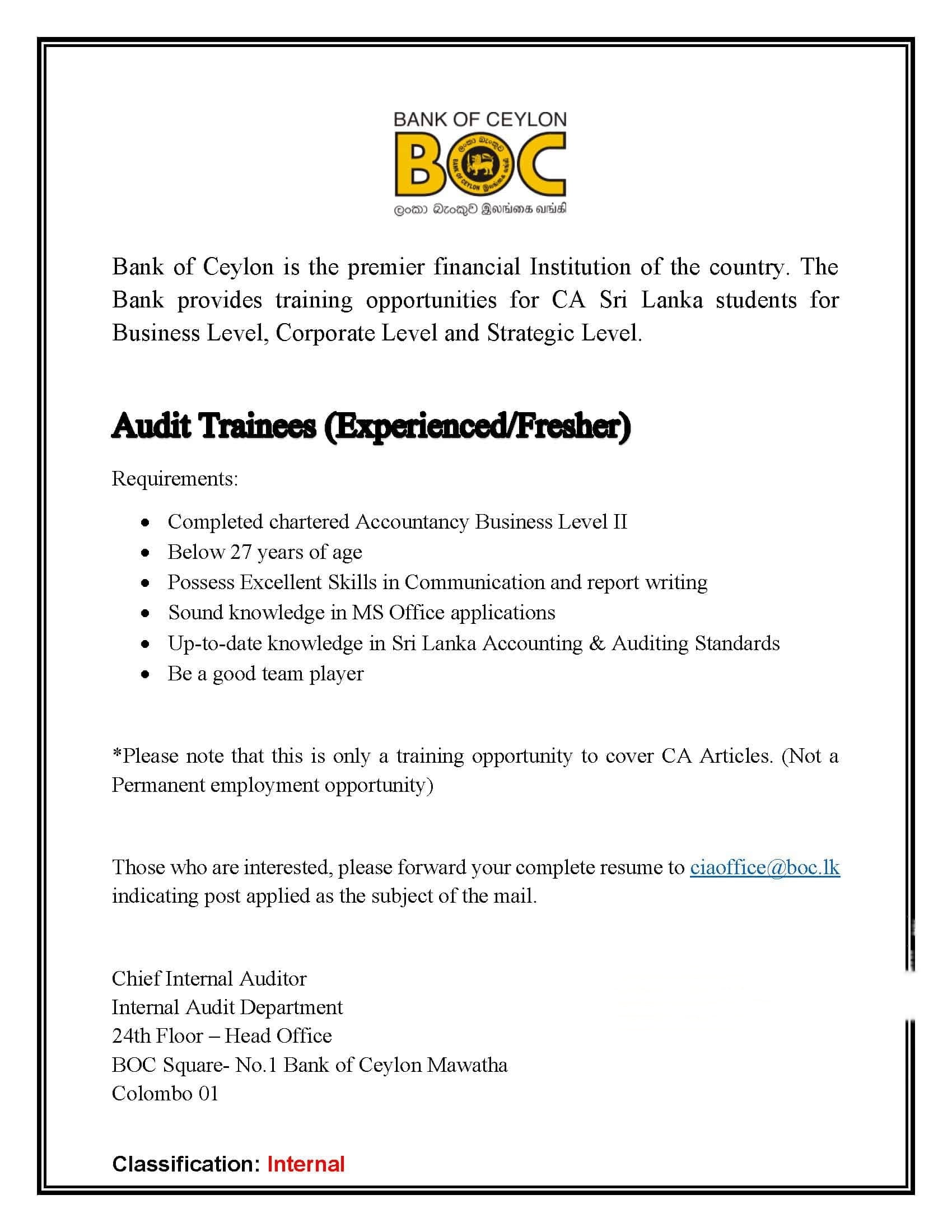 Those who are interested, please forward your complete resume to ciaoffice@boc.lk indicating post applie the subject of the mail.