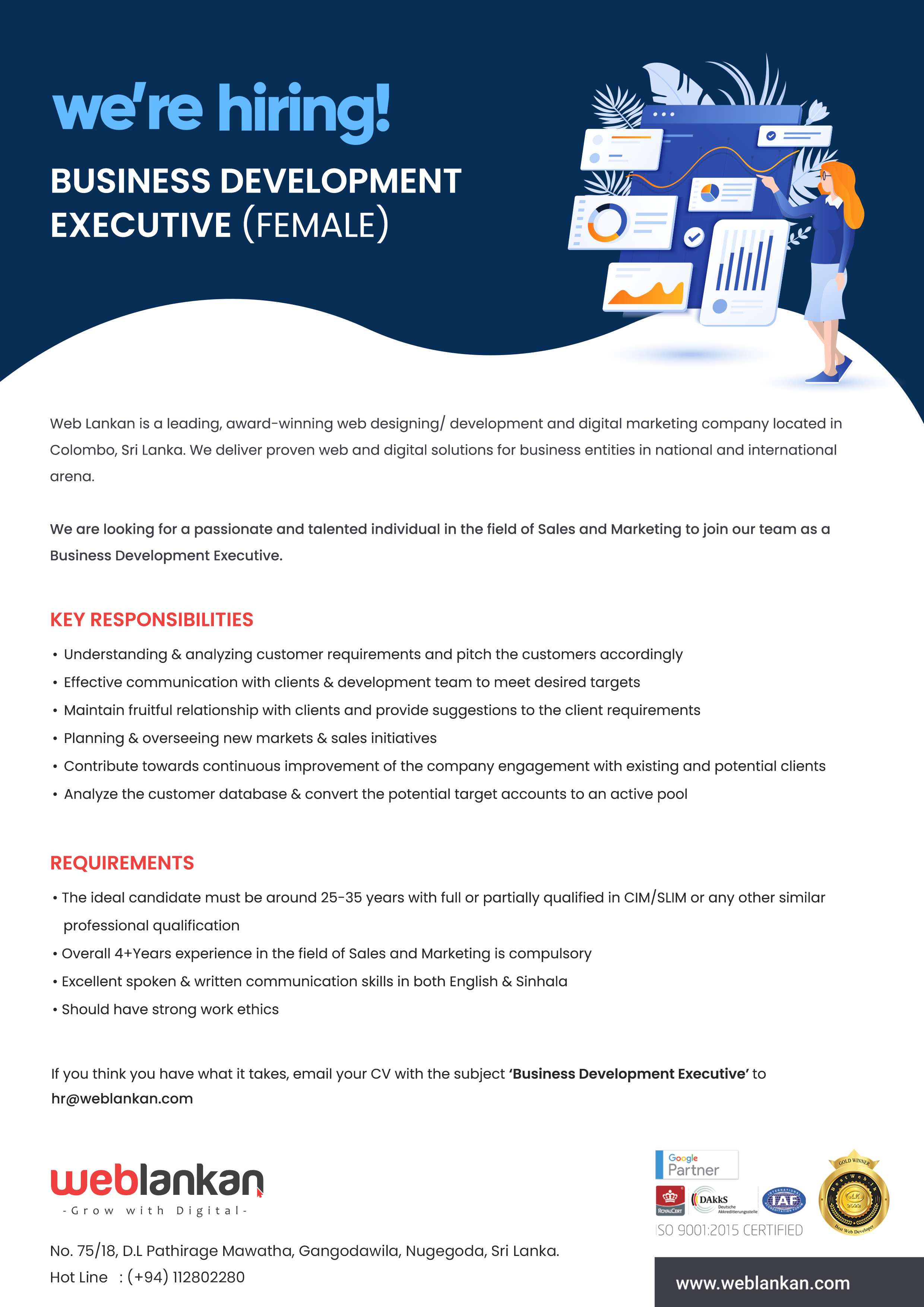 you think you have what it takes, email your CV with the subject ‘Business Development Executive’ to hr@weblankan.com