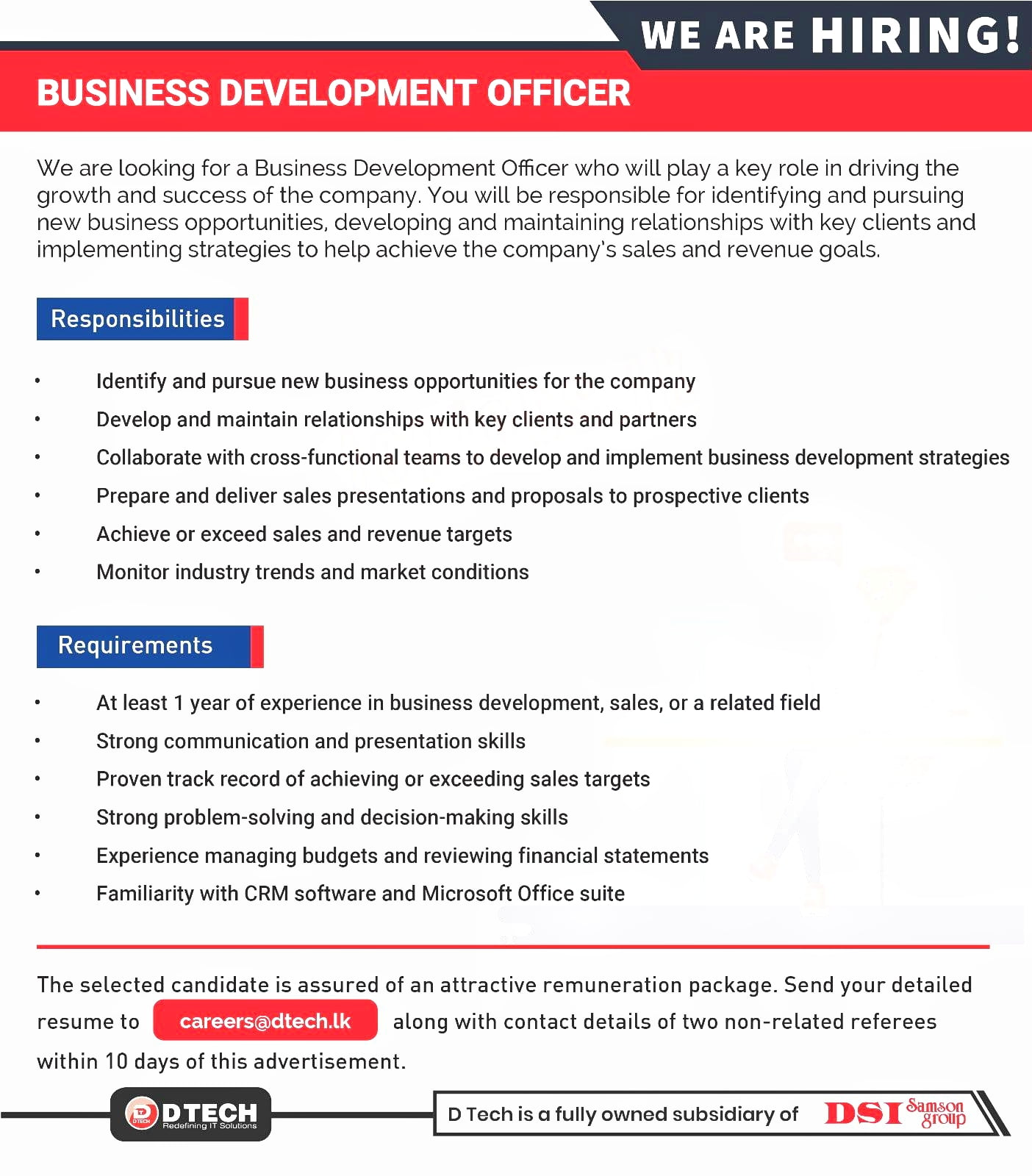 The selected candidate is assured of an attractive remuneration package. Send your detailed resume to careers@dtech.lk along with contact details of two non-related referees within 10 days of this advertisement.