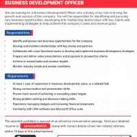We are looking for a Business Development Officer who will play a key role in driving the growth and success of the company. You will be responsible for identifying and pursuing new business opportunities, developing and maintaining relationships with key clients and implementing strategies to help achieve the company’s sales and revenue goals.