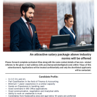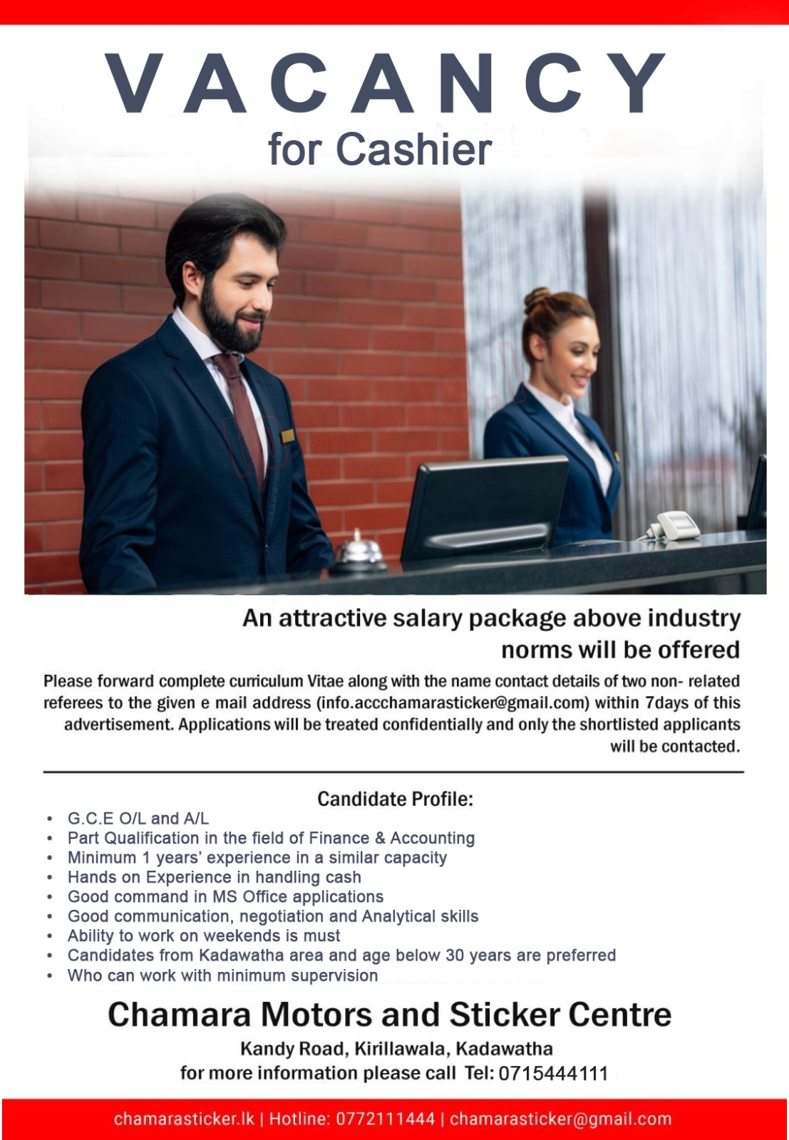 An attractive salary package above industrynorms will be offeredPlease forward complete curriculum Vitae along with the name contact details of two non-related referees to the given e mail address (info.accchamarasticker@gmail.com) within 7days of this advertisement. Applications will be treated confidentially and only the shortlisted applicants will be contacted.Candidate Profile:·G.C.E O/L and A/L•·Part Qualification in the field of Finance & Accounting Minimum 1 years’ experience in a similar capacity·Hands on Experience in handling cash·Good command in MS Office applications• Good communication, negotiation and Analytical skills·Ability to work on weekends is mustCandidates from Kadawatha area and age below 30 years are preferred Who can work with minimum supervisionChamara Motors and Sticker CentreKandy Road, Kirillawala, Kadawatha for more information please call Tel: 0715444111chamarasticker.lk | Hotline: 0772111444 | chamarasticker@gmail.com