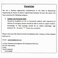We are a leading engineering establishment in the field of Mechanical Engineering & Import & deliver engineering hardware all over the island We have vacancies for following category.