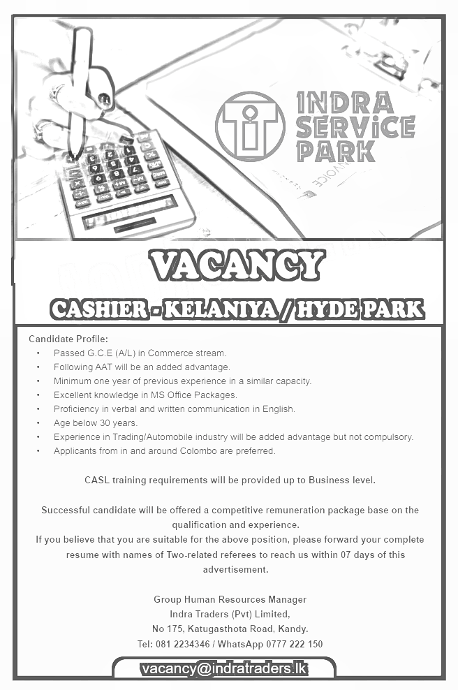 Group Human Resources Manager Indra Traders (Pvt) Limited, No 175, Katugasthota Road, Kandy. Tel: 081 2234346/WhatsApp 0777 222 150