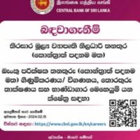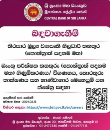 Operations Last date for receipt of applications – 2024.02.15 For details : https://www.cbsl.gov.lk/en/careers Director – Human Resources Central Bank of Sri Lanka, No. 30, President Mawatha, Colombo 01 Tel : 011-2477330 Fax + 011-2477715.
