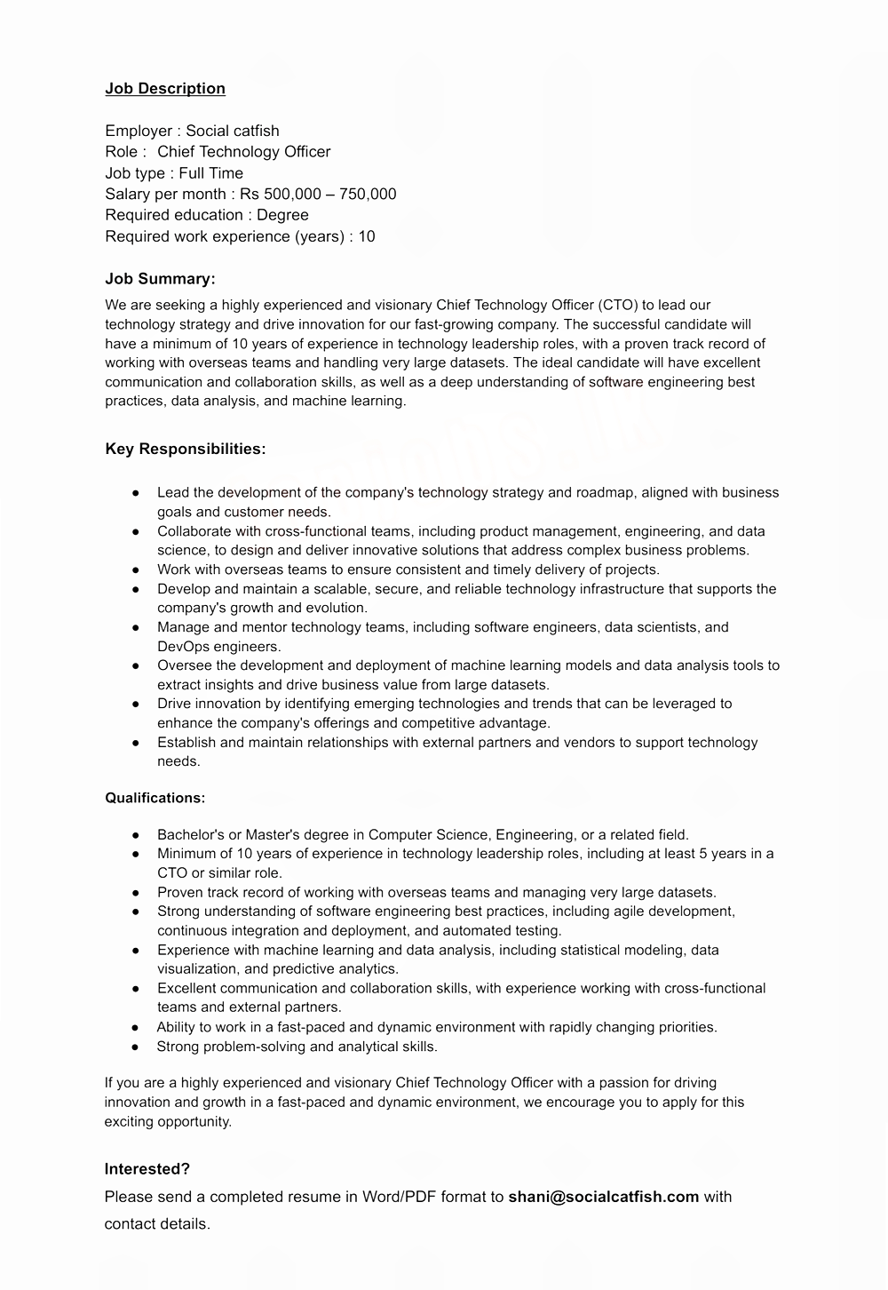 If you a highly experienced and visionary Chief Technology Officer with a passion for driving innovation and growth in a fast-paced and dynamic environment, we encourage you to apply for this exciting opportunity.