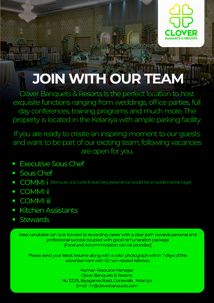 Please send your latest resume along with a color photograph within 7 days of this advertisement with 02 non-related referees.