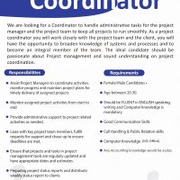 We are for a Coordinator to handle administrative tasks for the project manager and the project team to keep all projects to run smoothly. As a project coordinator you will work closely with the project team and the client, you will have the opportunity to broaden knowledge of systems and processes and to become an integral member of the team. The ideal candidate should be passionate about Project management and sound understanding on project coordination.