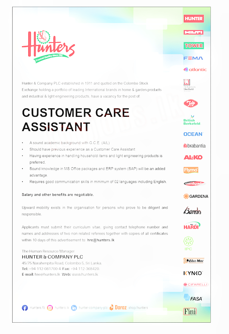 Applicants must submit their curriculum vitae, giving contact telephone number and names and addresses of two non related referees together with copies of all certificates within 10 days of this advertisement to: hre@hunters.lk