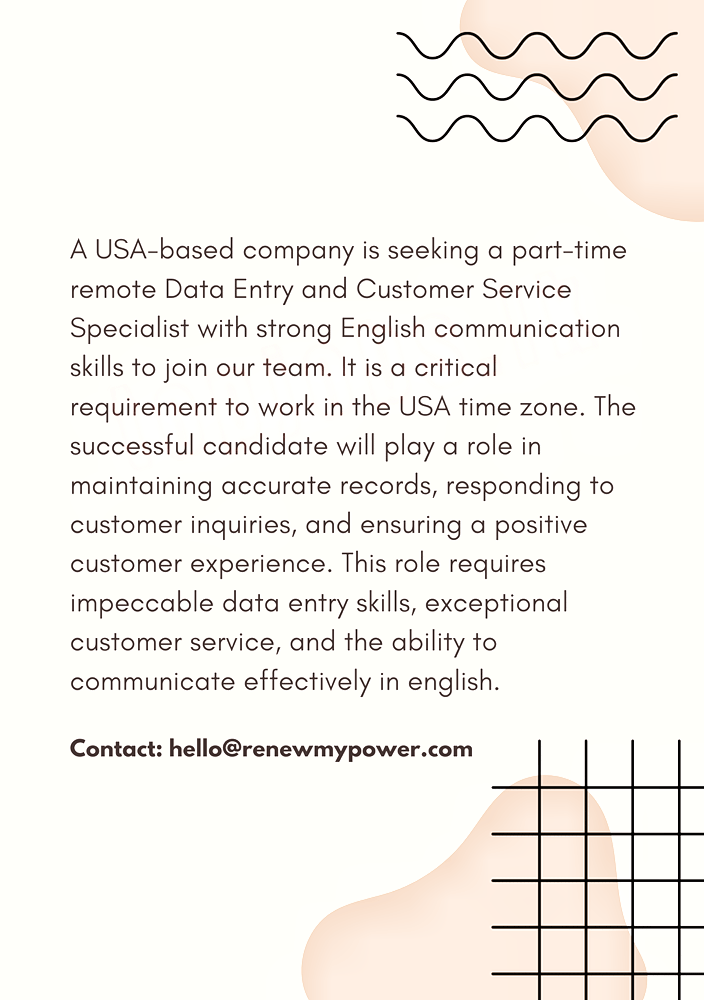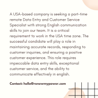 A USA-based company is seeking a part-time remote Data Entry and Customer Service Specialist with strong English communication skills to join our team. It is a critical requirement to work in the USA time zone. The successful candidate will play a role in maintaining accurate records, responding to customer inquiries, and ensuring a positive customer experience. This role requires impeccable data entry skills, exceptional customer service, and the ability to communicate effectively in english.