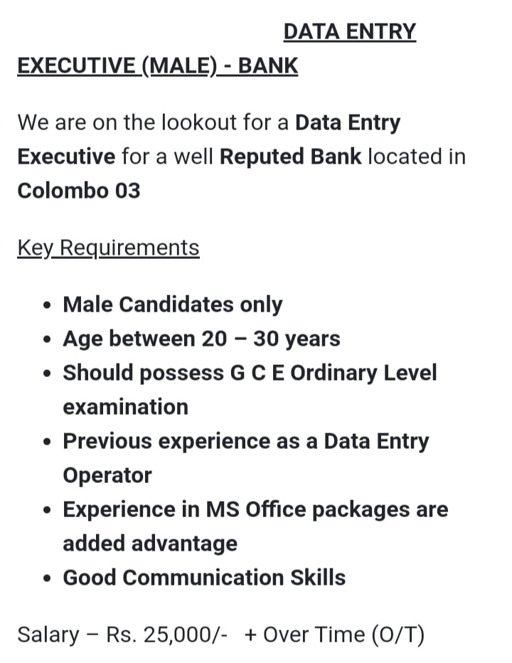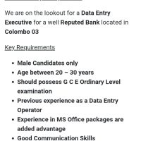 We are on the lookout for a Data Entry Executive for a well Reputed Bank located in Colombo 03