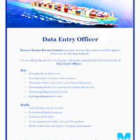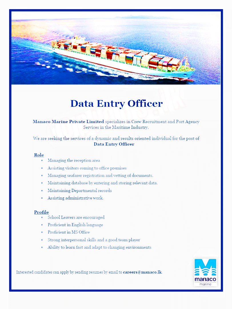 Manaco Marine Private Limited specializes in Crew Recruitment and Port Agency Services in the Maritime Industry.We are seeking the services of a dynamic and results oriented individual for the post of Data Entry OfficerRoleManaging the reception areaAssisting visitors coming to office premisesManaging seafarer registration and vetting of documents.Maintaining database by entering and storing relevant data.Maintaining Departmental recordsAssisting administrative work.ProfileSchool Leavers are encouragedProficient in English languageProficient in MS OfficeStrong interpersonal skills and a good team playerAbility to learn fast and adapt to changing environmentsInterested candidates can apply by sending resumes by email to careers@manaco.lk