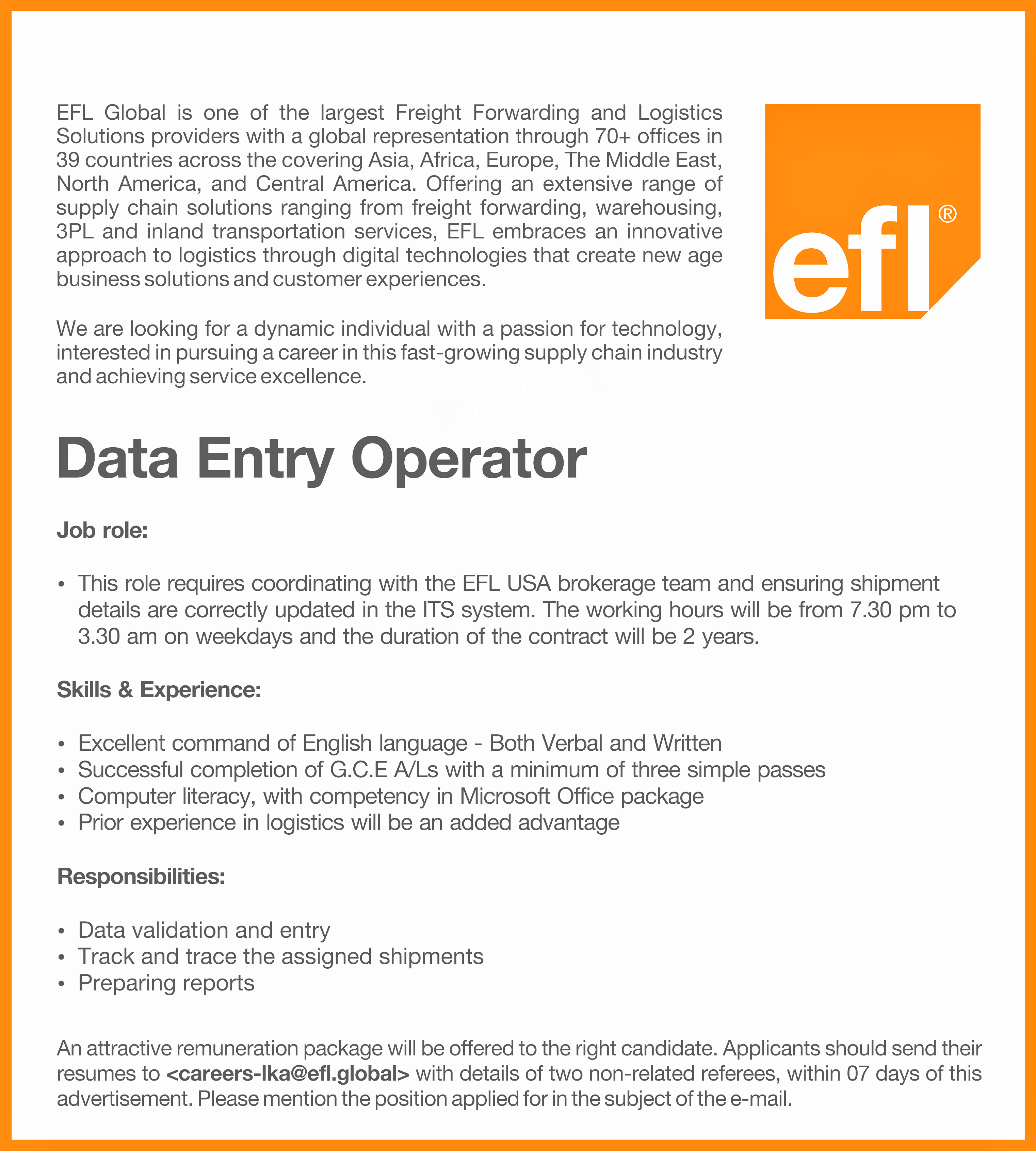 An attractive remuneration package will be offered to the right candidate. Applicants should send their resumes to careers-lka@efl.global with details of two non-related referees, within 07 days of this advertisement. Please mention the position applied for in the subject of the e-mail.