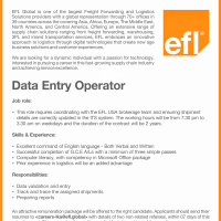• This role requires coordinating with the EFL USA brokerage team and ensuring shipment details are correctly updated in the ITS system. The working hours will be from 7.30 pm to 3.30 am on weekdays and the duration of the contract will be 2 years.