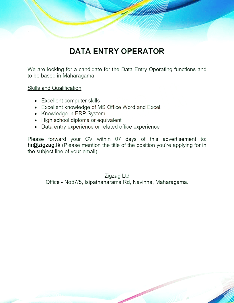 We are looking for a candidate for the Data Entry Operating functions and to be based in Maharagama.