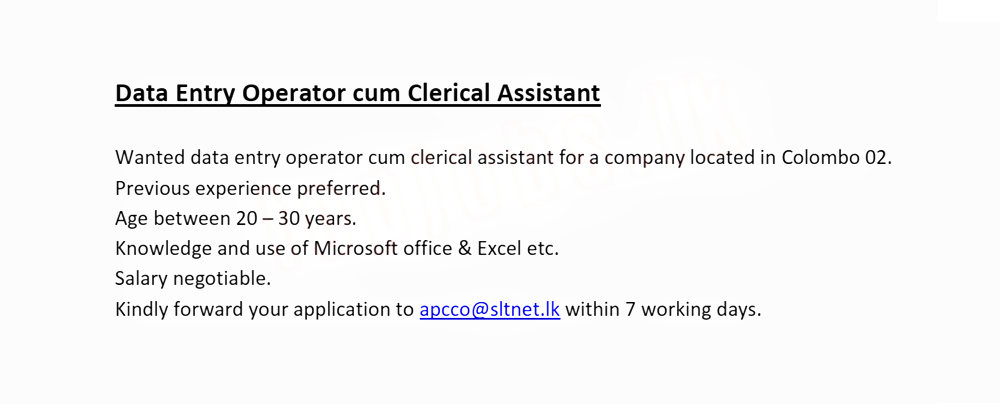 Wanted data entry operator cum clerical assistant for a company located in Colombo 02.