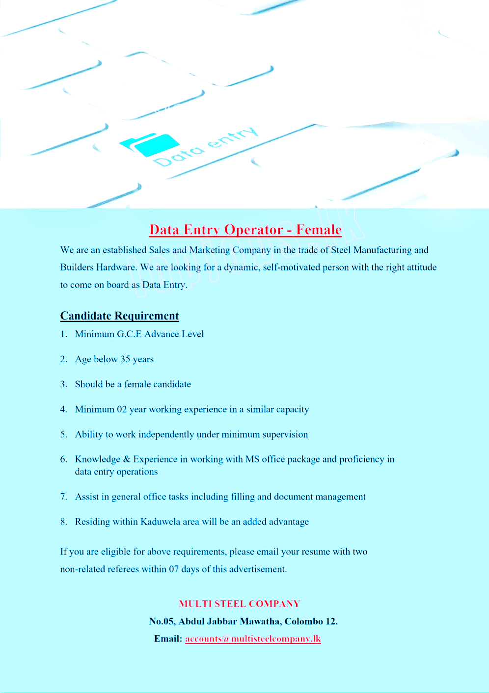 We are an established Sales and Marketing Company in the trade of Steel Manufacturing and Builders Hardware. We are looking for a dynamic, self-motivated person with the right attitude to come on board as Data Entry.
