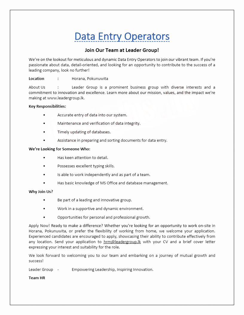 any location. Send your application to hrm@leadergroup.lk with your CV and a brief cover letter