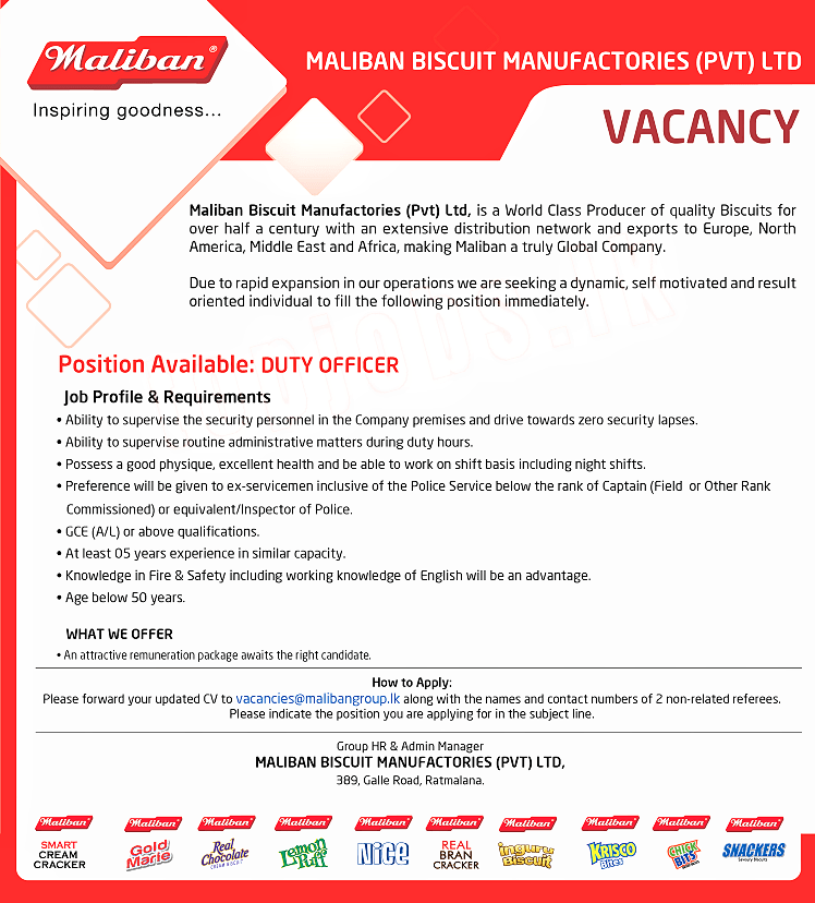 Group HR & Admin Manager MALIBAN BISCUIT MANUFACTORIES (PVT) LTD, 389, Galle Road, Ratmalana.