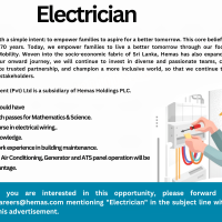 If you are interested in this opportunity, please forward your CV to careers@hemas.com mentioning “Electrician” in the subject line within 7 days of this advertisement.