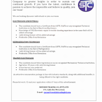 The candidate should have a Certificate from CGTTI, NAITA or any recognized Technical Institution in the field of Refrigeration
