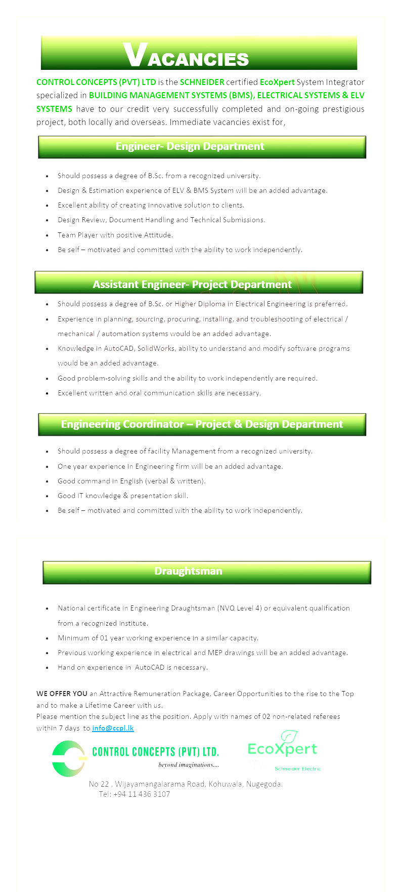 Draughtsman National certificate in Engineering Draughtsman (NVQ Level 4) or equivalent qualificationfrom a recognized institute.•Minimum of 01 year working experience in a similar capacity.•Previous working experience in electrical and MEP drawings will be an added advantage.Hand on experience in AutoCAD is necessary.WE OFFER YOU an Attractive Remuneration Package, Career Opportunities to the rise to the Top and to make a Lifetime Career with us.Please mention the subject line as the position. Apply with names of 02 non-related referees within 7 days to info@ccpl.lk