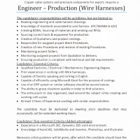 Copper cable systems and precision components for export, requires a Engineer – Production (Wire Harnesses)