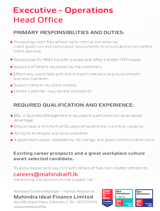 Assistant General Manager Human Resources Mahindra Ideal Finance Limited No.299, Union Place, Colombo 2. Tel: 0117724724 www.mahindraiflik