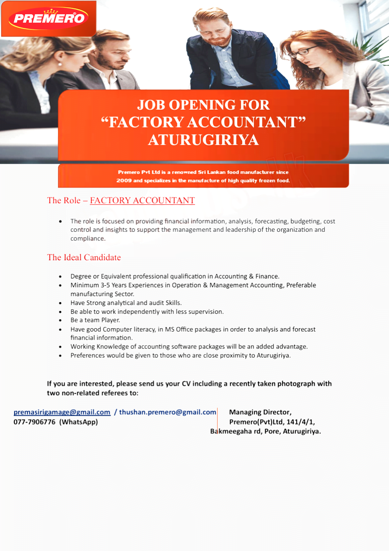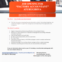 JOB OPENING FOR “FACTORY ACCOUNTANT” ATURUGIRIYA