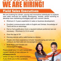 Excellent communication skills in English and Sinhala. Knowledge of Tamil will be an advantage.