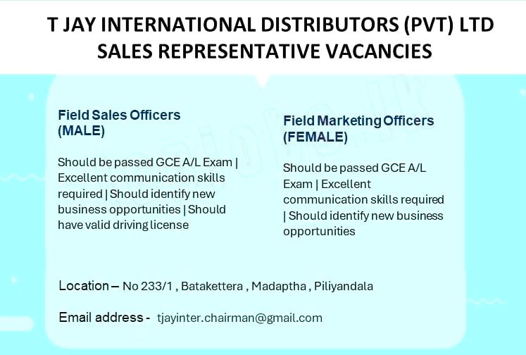 Should be passed GCE A/L Exam | Excellent communication skills required | Should identify new business opportunities | Should have valid driving license