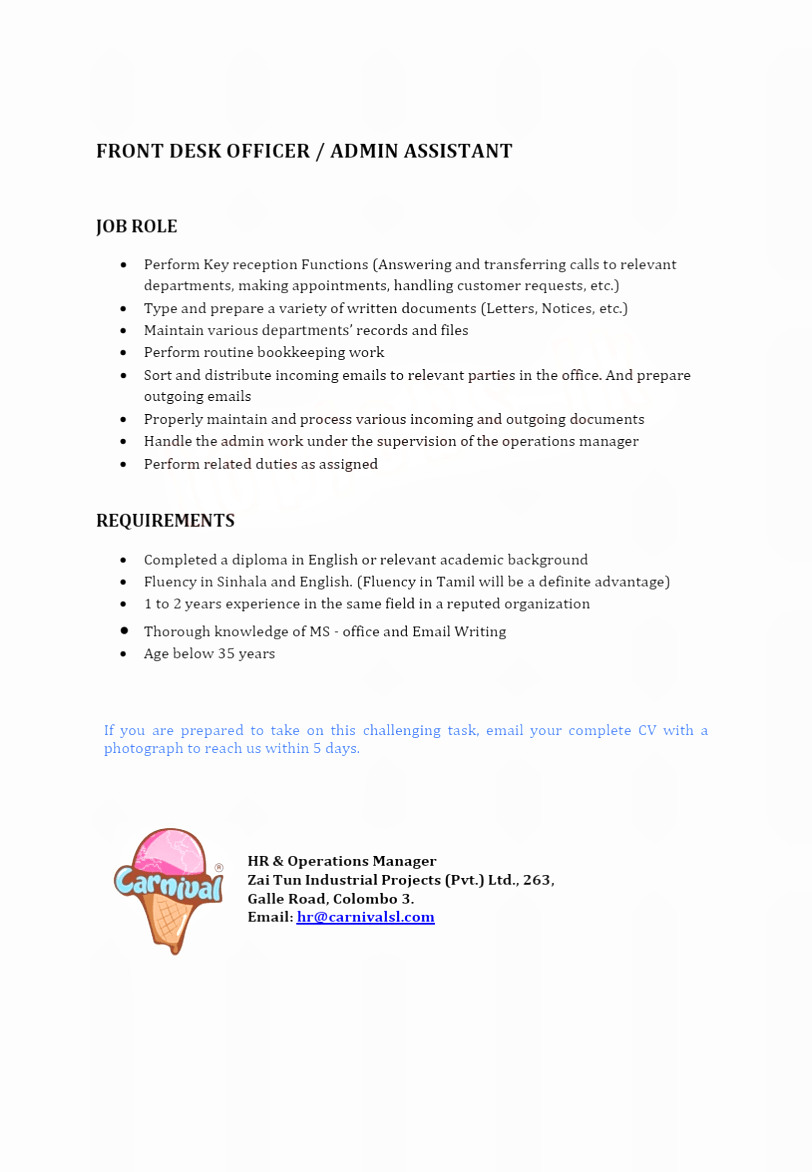 HR & Operations Manager Zai Tun Industrial Projects (Pvt.) Ltd., 263, Galle Road, Colombo 3.