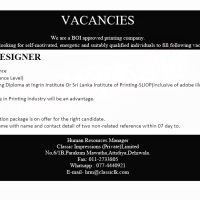 VACANCIES We are a BOI approved printing company. we are looking for self-motivated, energetic and suitably qualified individuals to fill following vacancy. GRAPHIC DESIGNER Qualification & Experience Pass G.C.E. (Advance Level) Graphic Designing Diploma at Ingrin Institute Or Sri Lanka Institute of Printing-SLIOP (inclusive of adobe illustrator & Adobe In Design) Work experience in Printing Industry will be an advantage. Age 25-35 Years An attractive remuneration package is on offer for the right candidate. Please submit your resume with name and contact detail of two non-related reference within 07 day to. Human Resources Manager Classic Impressions (Private) Limited No,6/1B, Parakum Mawatha, Attidiya, Dehiwala. Fax: 011-2733805 Whatsapp: 077-4440921 E-mail- hrm@classiclk.com
