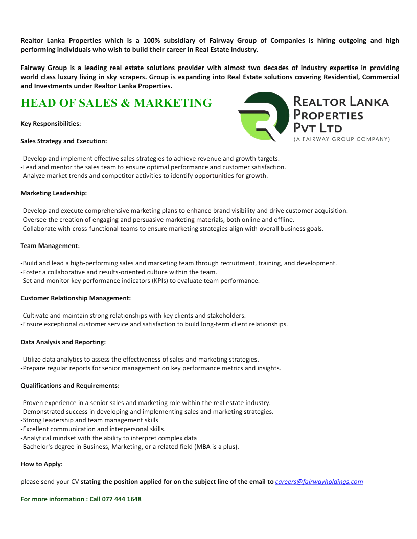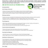 Realtor Lanka Properties which is a 100% subsidiary of Fairway Group of Companies is hiring outgoing and high performing individuals who wish to build their career in Real Estate industry.