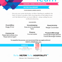 Discover your career destination at Hilton Yala Resort, nestled in the heart of nature’s paradise. With stunning vistas of the Indian Ocean and Yala National Park, our resort offers an unique setting for your professional journey.
