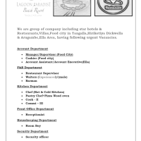 Accommodation & Food is provided. Please forward your CV to, account@lagoonparadisebeachresort.com or contact