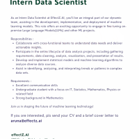 As an Intern Data Scientist at EffectZ.Al, you’ll be an integral part of our dynamic team, assisting in the development, implementation, and deployment of machine learning models. This role offers an exciting opportunity to engage in fine tuning on- premise Large Language Models (LLMs) and other ML projects.