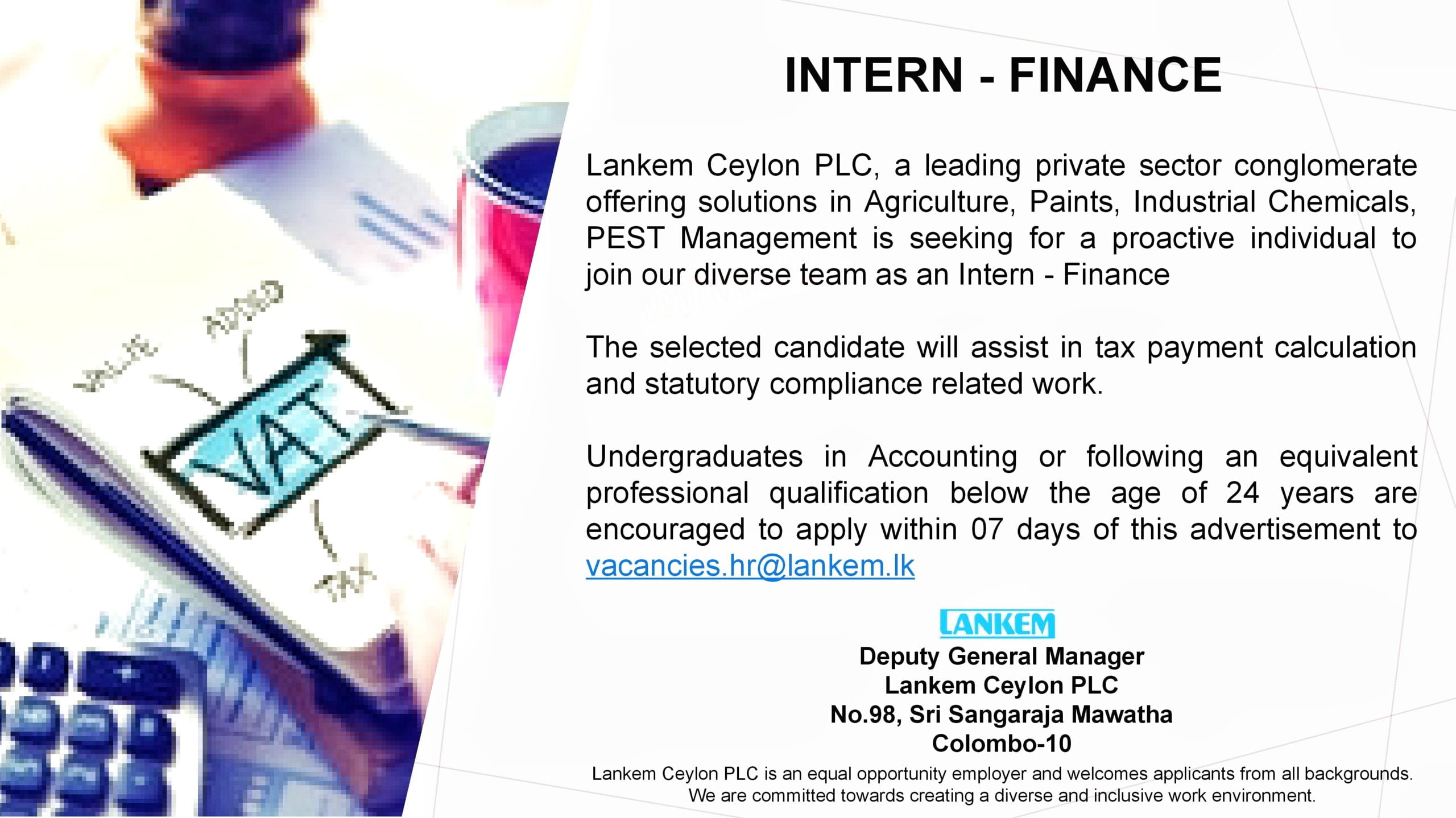Undergraduates in Accounting or following an equivalent professional qualification below the age of 24 years are encouraged to apply within 07 days of this advertisement to vacancies.hr@lankem.lk