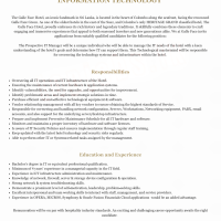 The Prospective IT Manager will be a unique individual who will be able to manage the IT needs of the hotel with a keen understanding of the hotel’s goals and determine how IT can support them. This Technological mastermind will be responsible for overseeing the technology systems and infrastructure within the hotel.