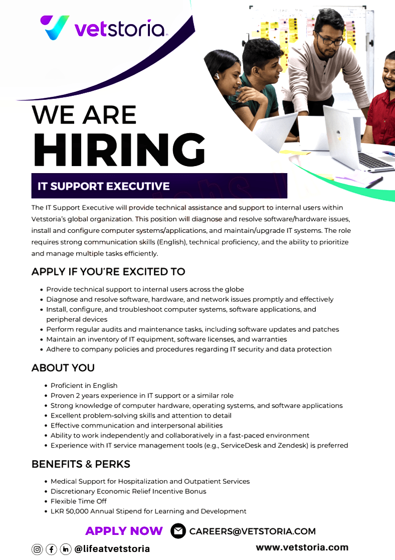 The IT Support Executive will provide technical assistance and support to internal users within Vetstoria’s global organization. This position will diagnose and resolve software/hardware issues, install and configure computer systems/applications, and maintain/upgrade IT systems. The role requires strong communication skills (English), technical proficiency, and the ability to prioritize and manage multiple tasks efficiently.