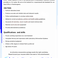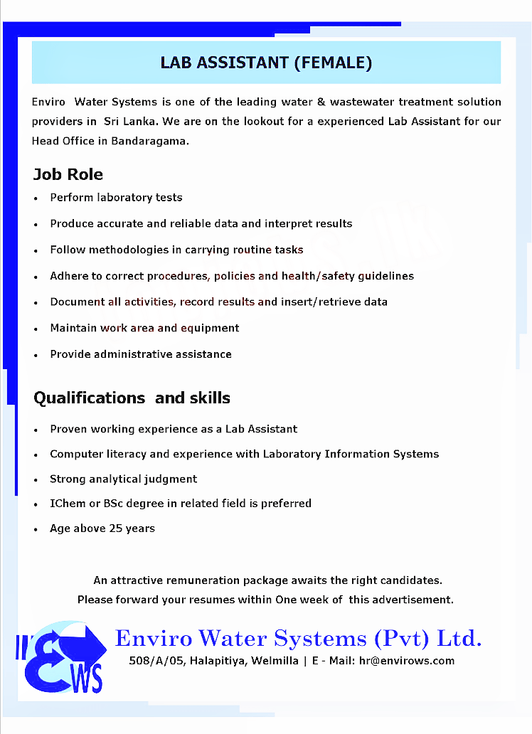 Enviro Water Systems is one of the leading water & wastewater treatment solution providers in Sri Lanka. We are on the lookout for a experienced Lab Assistant for our