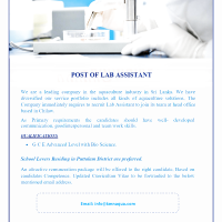 We are a leading company in the aquaculture industry in Sri Lanka. We have diversified our service portfolio includes all kinds of aquaculture solutions. The Company immediately requires to recruit Lab Assistant to join its team at head office based in Chilaw.